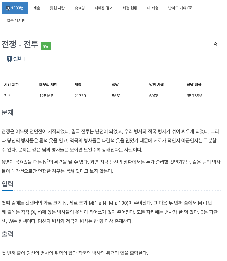 [Swift 백준] 1303 전쟁 - 전투 본문